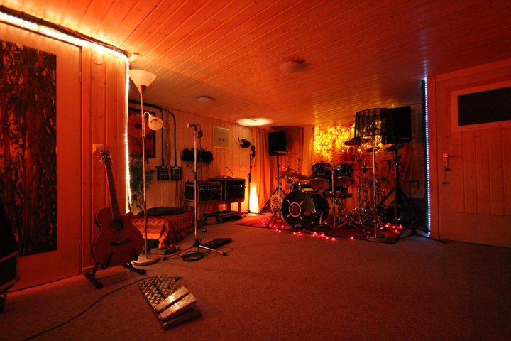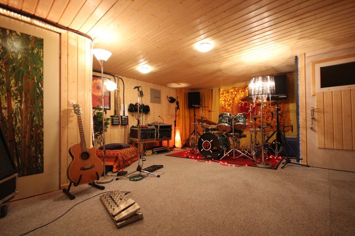 Aufnahmeraum: ca. 25 qm groß, sehr angenehme Akustik, und Platz genug um eine Band komplett aufzunehmen (OK - mit ´ner Big Band + Orchester wird´s etwas eng ;-). Für eine akustische Trennung stehen Stellwände bereit.